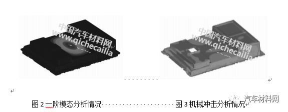采用ISO16750中规定的方法对动力电池箱结构的抗机械冲击能力进行分析。冲击脉冲采用半正弦形脉冲波形,峰值加速度为500m/s2,持续时间为6ms。冲击的加速度在所用6个方向上进行。分析结果显示,电池托盘和壳体的最大应力为76.5MPa远小于材料的许用应力(图3)。