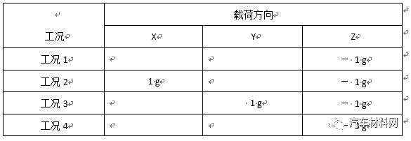 按照表1中数值,分4个工况对动力电池进行加载,主要是考察电池系统在车辆正常行驶过程中,由于刹车、转弯、跳跃等因素,电池系统承受来自不同方向载荷下的结构强度。