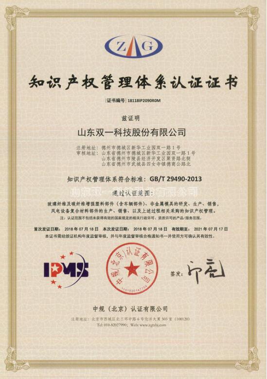 近日,经过严格的材料评审、现场审核等完整的考核程序,双一科技顺利通过中规(北京)认证有限公司的知识产权管理体系审核并获得认证证书(证书编号:18118IP2090ROM)。