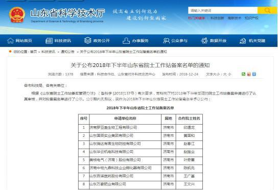 12月24日,山东省科技厅公布了2018年下半年山东省院士工作站备案名单,山东双一科技股份有限公司院士工作站成功通过备案。