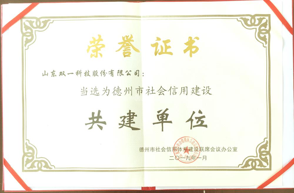 > 双一科技荣获德州市社会信用建设共建单位荣誉称号