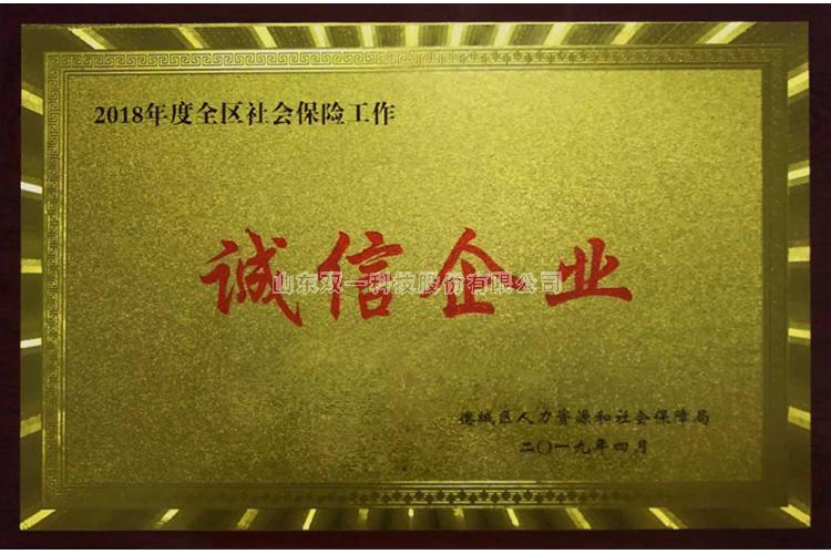 2019年4月4日,山东双一科技股份有限公司获得德城区2018年度社会保险工作诚信企业荣誉称号,德城区副区长杨振生为双一科技颁奖。