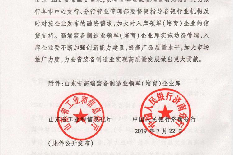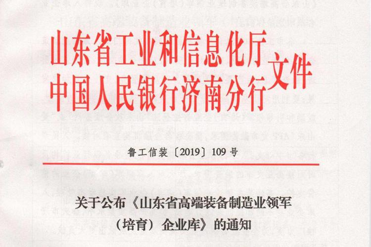 日前,山东省工业和信息化厅发布了鲁工信装〔2019〕109号《关于公布《山东省高端装备制造业领军(培育)企业库》的通知》,山东双一科技股份有限公司成功列入山东省高端装备制造业领军(培育)企业库。