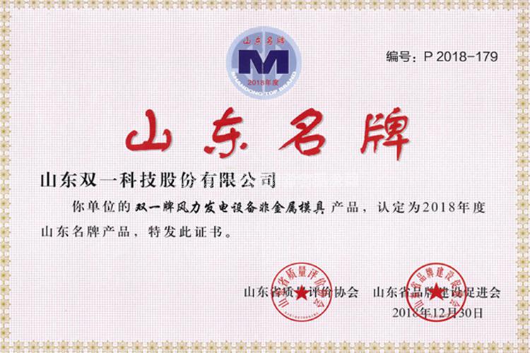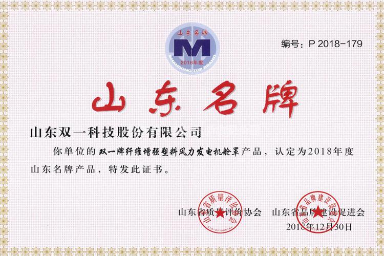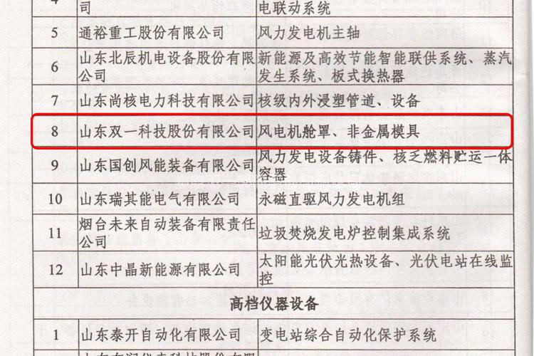 2018年,山东省工信厅为贯彻落实新旧动能转换重大工程战略部署和《山东省高端装备制造业发展规划(2018-2025年)》,加快培育高端装备制造骨干企业,确定开展高端装备制造业领军企业培育工作,计划遴选一批创新能力强、技术水平高、发展潜力大、辐射带动强的骨干企业,列入领军企业培育库,通过服务“直通车”机制,聚焦重点,强化服务,帮助企业做大做强,打造拉动装备制造业高质量发展的“火车头”和主力军。通过区、市两级部门推荐及专家评审等环节,山东双一科技股份有限公司成功列入山东省高端装备制造业领域(培育)企业库,企业风力发电机舱罩、非金属模具两项产品被评为新能源装备的拳头产品。