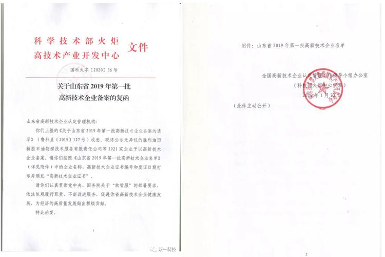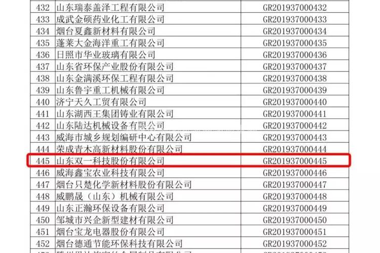 2020年1月末,国家科学技术部火炬高技术产业开发中心发布了《关于山东省2019年第一批高新技术企业备案的复函》国科火字【2020】36号文件,山东双一科技股份有限公司再次列入高新技术企业认定名单,本次认定系双一科技原高新技术企业证书第三次有效期满后进行的重新认定。