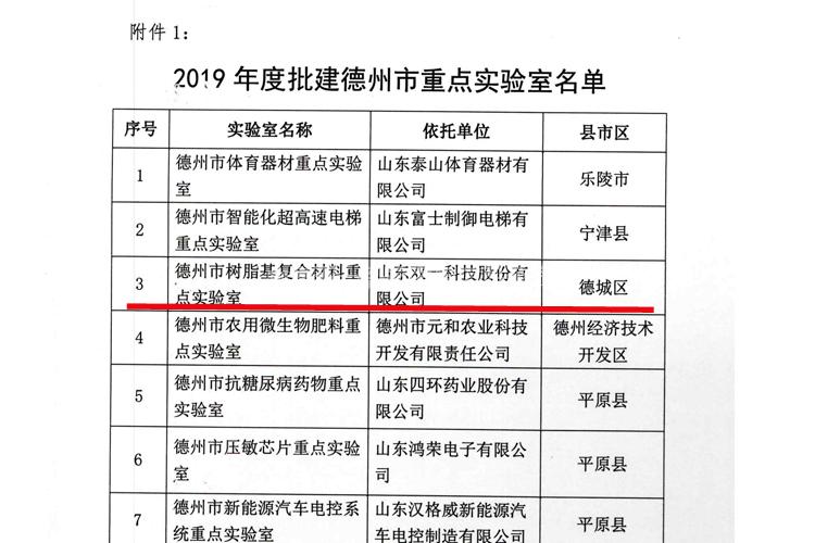 近日,德州市科技局发布了《关于公示拟批建2019年度德州市重点实验室和市工程技术研究中心的通知》,其中,山东双一科技股份有限公司“德州市树脂基复合材料重点实验室”获得批复组建。