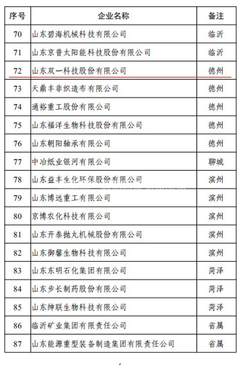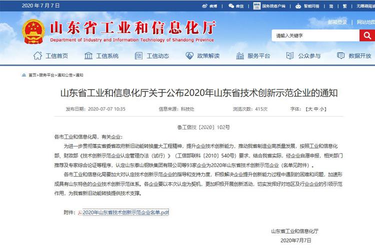 为深入实施创新驱动发展战略,树立一批技术创新能力强、产业化成果突出、掌握关键核心技术,具有示范引领带动作用的领军企业,推动山东省制造业新旧动能转换工作深入开展,按照《技术创新示范企业认定管理办法(试行)》(工信部联科〔2010〕540号)要求,山东省工业和信息化厅组织开展了2020年国家及省级技术创新示范企业推荐工作,经过区、市工信部门推荐和相关行业专家论证,山东双一科技股份有限公司(股票代码:300690)被认定为山东省2020年度技术创新示范企业。