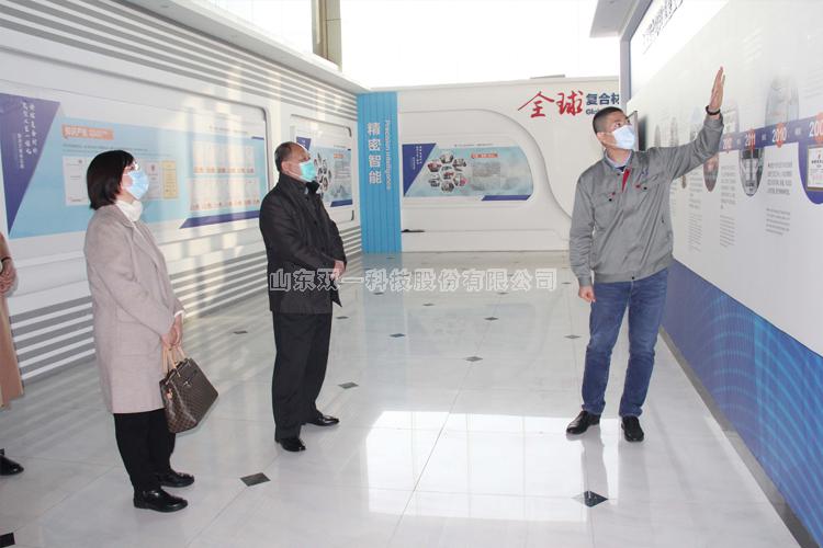 李敬华书记一行首先在双一科技人力资源部史洪杰部长的陪同下参观了企业展厅,通过史部长的介绍,李书记对双一科技的发展历程、研发实力、人才发展方向以及产品定位有了全面了解,对双一科技的企业实力、发展前景给予充分肯定。