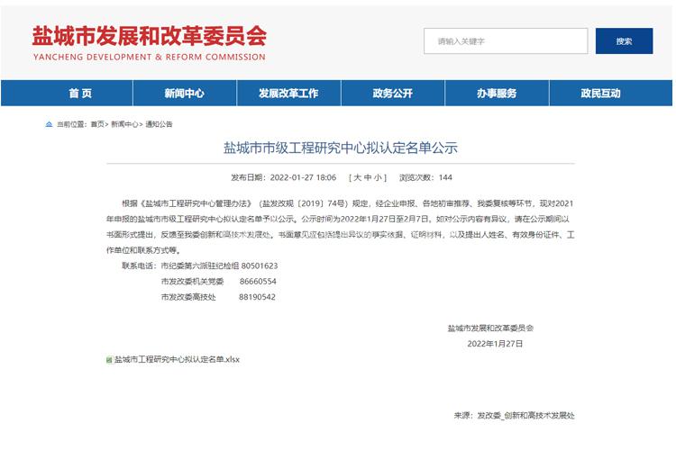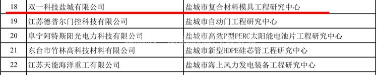 近日,江苏省盐城市发展和改革委员会下发了《盐城市市级工程研究中心拟认定名单公示》,双一科技盐城有限公司承担的复合材料模具工程研究中心被认定为“盐城市工程研究中心”。这是继公司研发机构被盐城市科学技术局认定为市级工程技术研究中心之后,获批的又一市级创新研发平台。