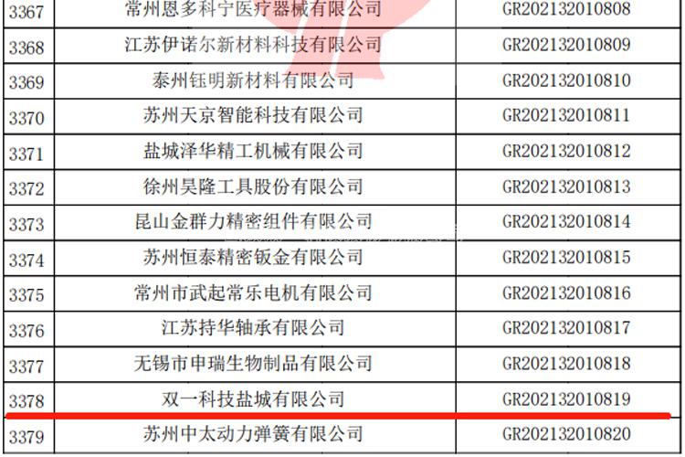 2022年2月21日,全国高新技术企业认定管理工作领导小组办公室公布了《关于对江苏省2021年认定的第四批高新技术企业进行备案的公告》,双一科技盐城有限公司被认定为高新技术企业。